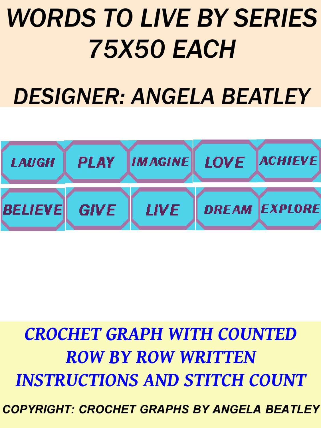 Words to live by complete set of 10 crochet graph patterns 75x50 each laugh, play, imagine, love, believe, give, dream, live, quilt blocks